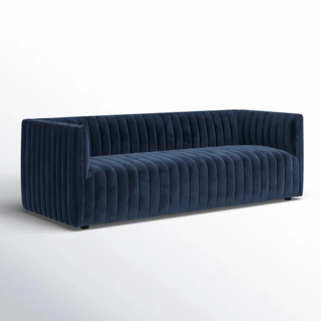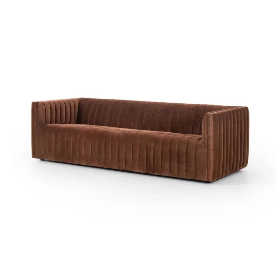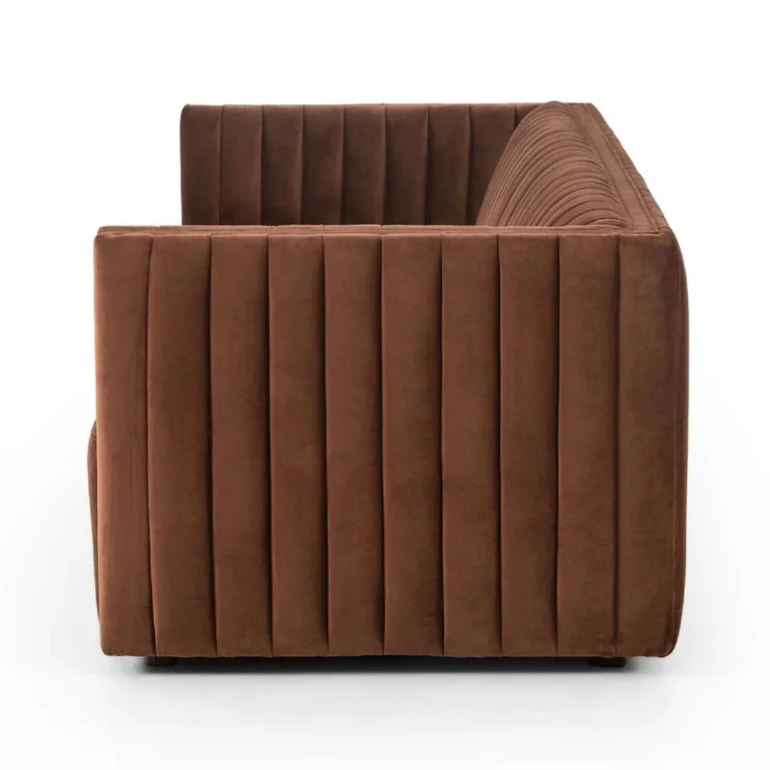 Velvety poly-blend in a rich auburn hue takes on dramatic channeling for trend-forward texture on this sumptuous seating.