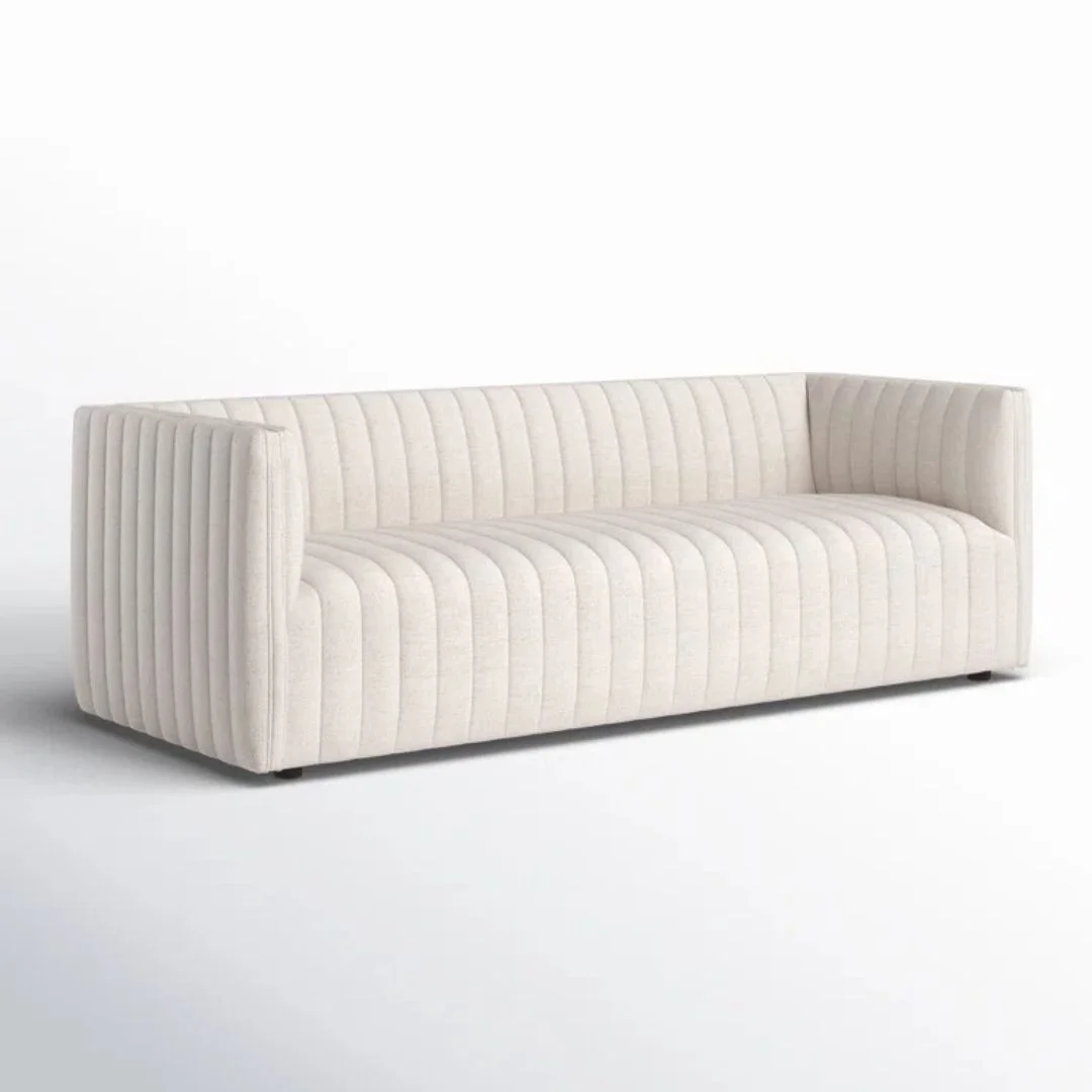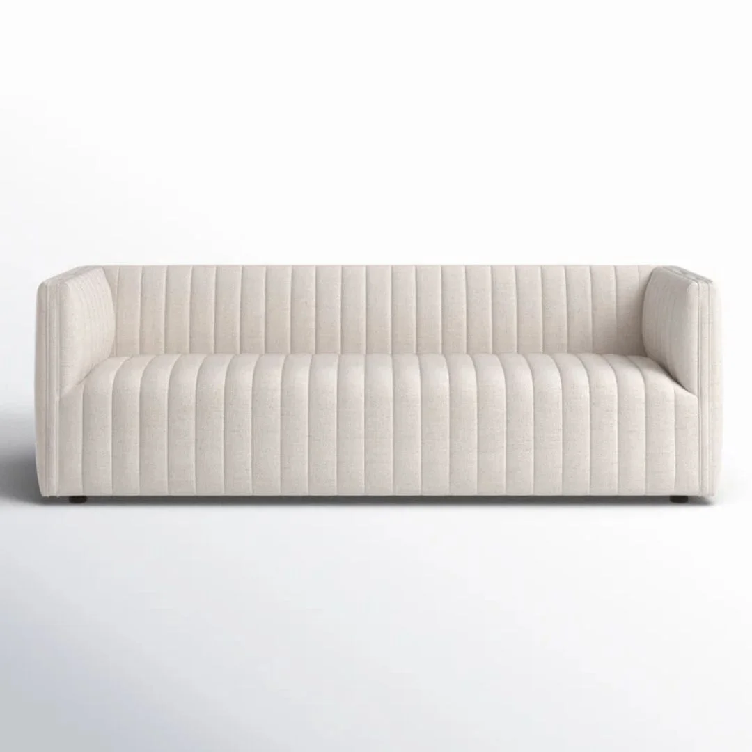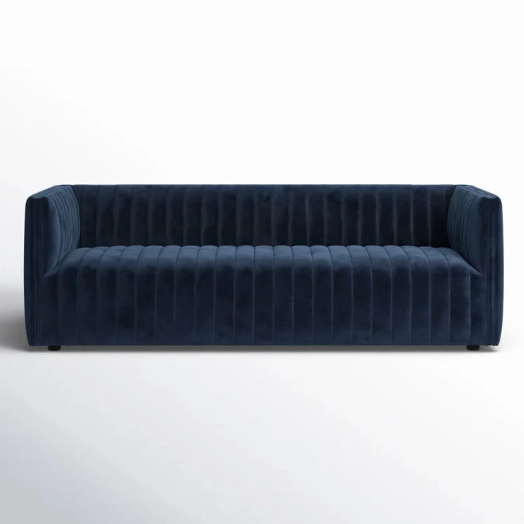 Velvety poly-blend in a rich auburn hue takes on dramatic channeling for trend-forward texture on this sumptuous seating.