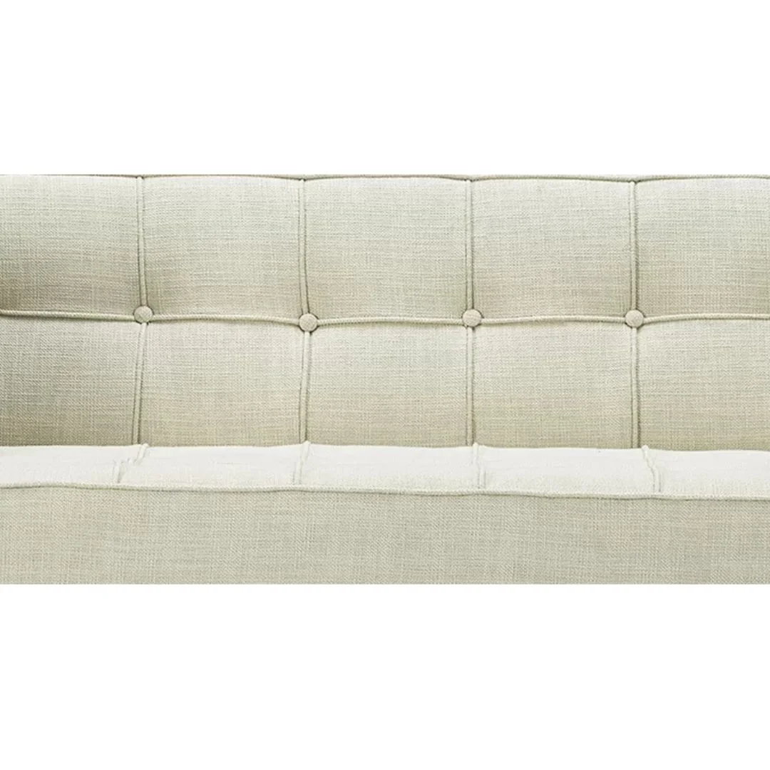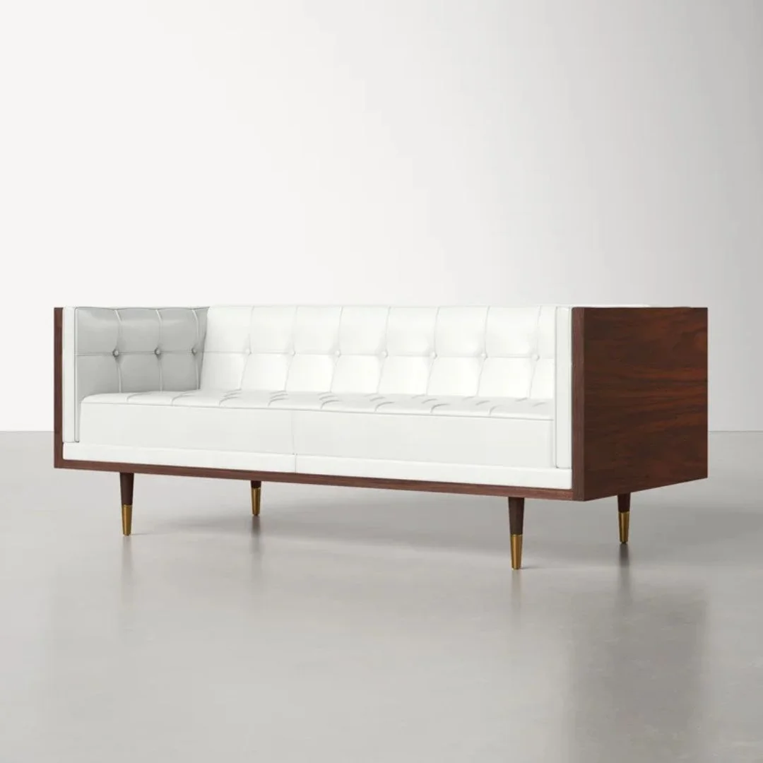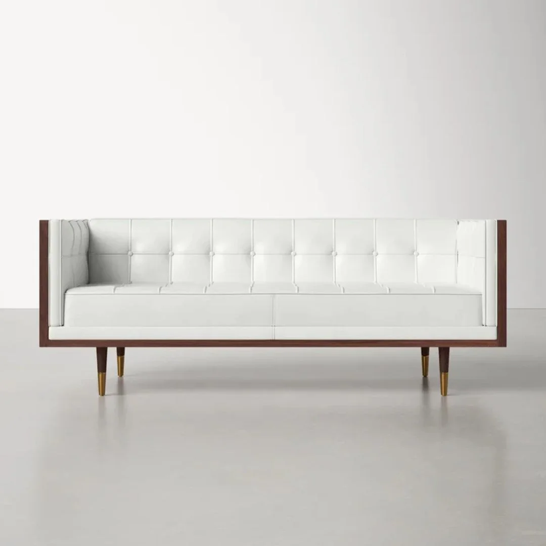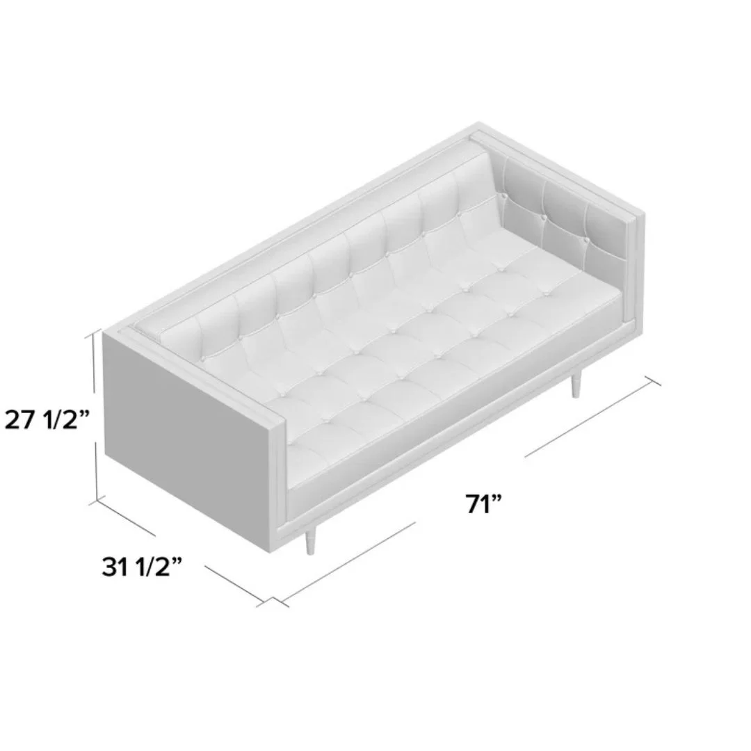 Brimming with mid-century modern style, this loveseat features plush + durable upholstery nestled into a geometric shell built from kiln-dried hardwood. Tailored button tufting and brass-tipped cone legs add polish to the retro silhouette. Delivers seating for two + compliments for years.