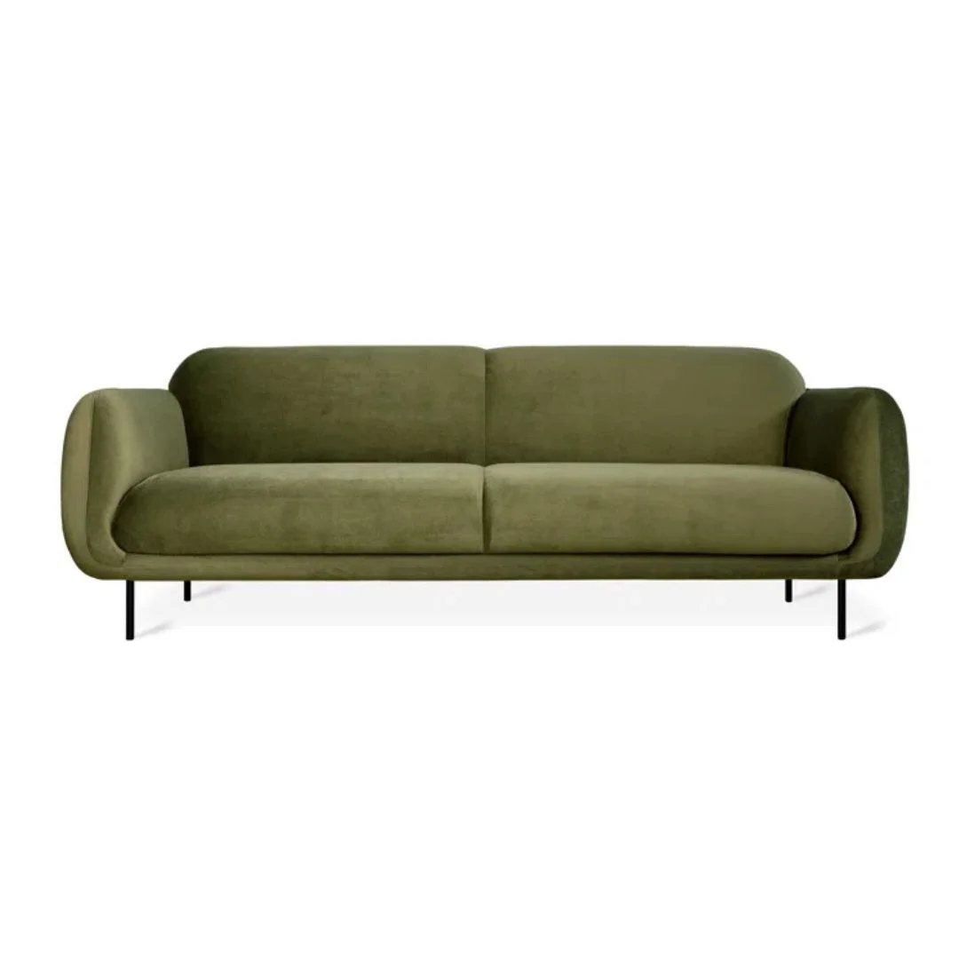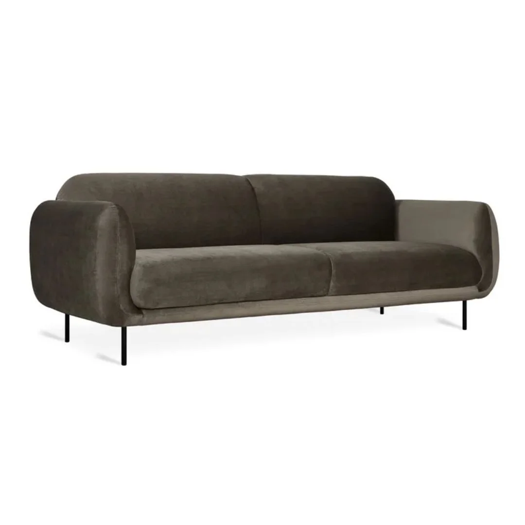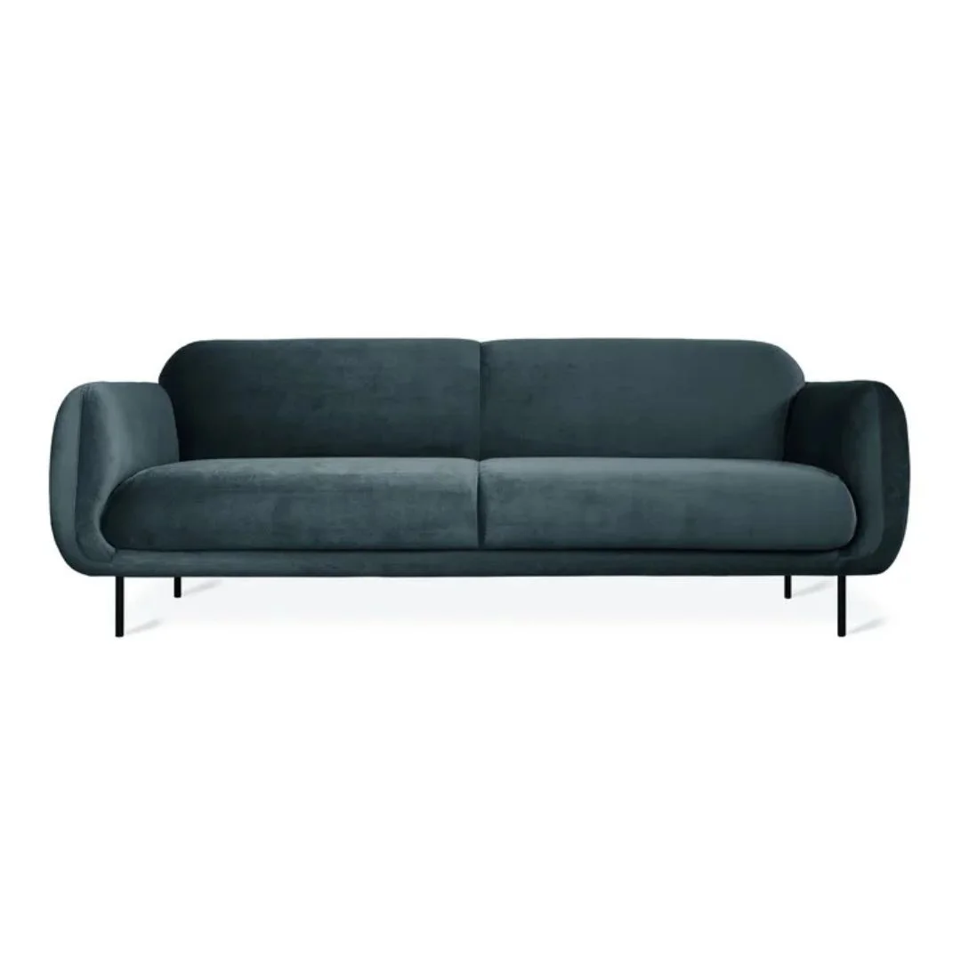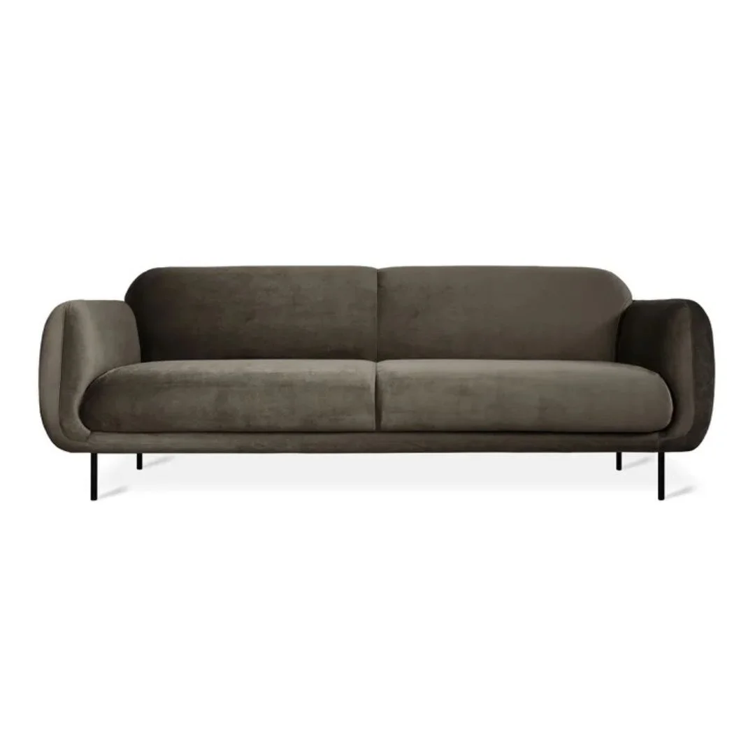 Envelop yourself in mod luxury with the plush and sophisticated Nord Sofa. With an elegant, curved silhouette, the Nord sofa invites you to sink in and stay awhile, with a retro yet timeless shape that’s emphasized by an ample, low-profile back and feminine curved arms. Each piece has been expertly crafted in lush fabric, with a tight seat and back atop black steel legs that add a modern touch to the piece’s striking ‘70s-inspired sensibilities.