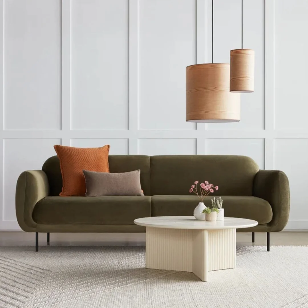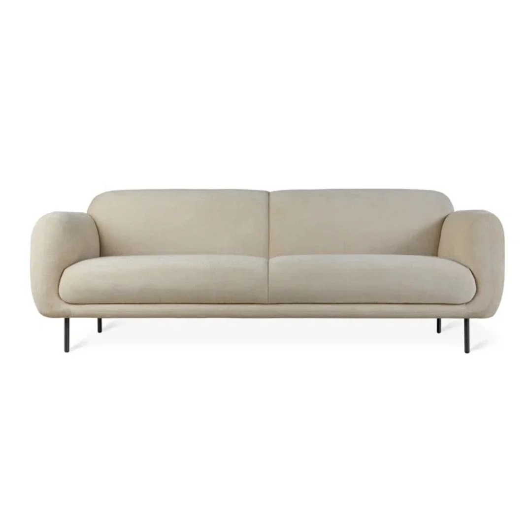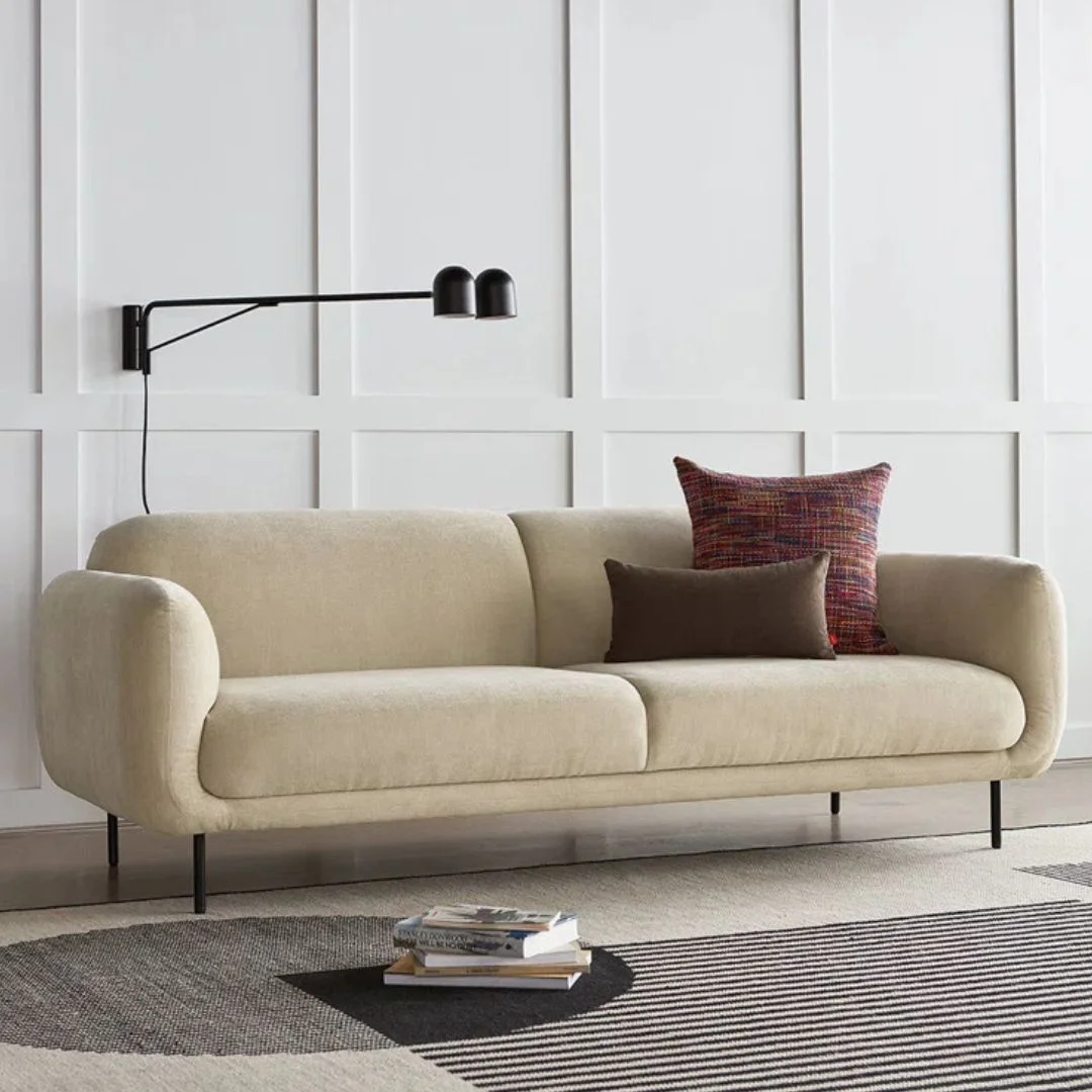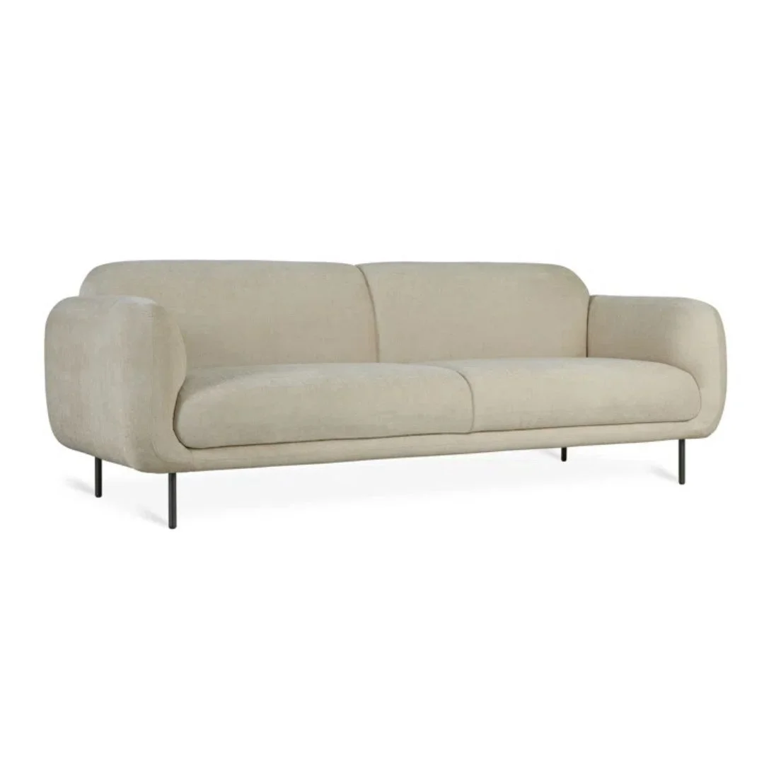 Envelop yourself in mod luxury with the plush and sophisticated Nord Sofa. With an elegant, curved silhouette, the Nord sofa invites you to sink in and stay awhile, with a retro yet timeless shape that’s emphasized by an ample, low-profile back and feminine curved arms. Each piece has been expertly crafted in lush fabric, with a tight seat and back atop black steel legs that add a modern touch to the piece’s striking ‘70s-inspired sensibilities.